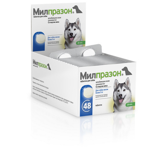 Препарат широкого спектра дії проти кишкових, а також серцевих, легеневих і очних гельмінтів. Показання Призначають з лікувальною і профілактичною метою при нематодозах, цестодозах і асоціативних нематод-цестодозних инвазиях, викликаних гельмінтами наступних видів: цестоди - Dipylidium caninum, Taenia spp., Echinococcus spp., Mesocestoides spp.; нематоди - Ancylostoma caninum, Toxocara canis, Toxocara leonina, Trichuris vulpis, Thelazia callipaeda; Angiostrongylus vasorum (Знижує інтенсивність зараження), Crenosoma vulpis (Знижує інтенсивність зараження), Dirofilaria immitis (профілактика захворювання). Дозування Застосовують одноразово під час годування з невеликою кількістю корму або вводять примусово на корінь язика після годування мінімальна терапевтична доза 0,5 мг мільбеміцина оксима і 5 мг празиквантела на 1 кг маси тварини. 5-10 кг - 1 таблетка; 10–25 кг - 1 таблетка 25–50 кг - 2 таблетки 50–75 кг - 3 таблетки Препарат можна застосовувати вагітним і лактуючим тваринам. Не слід застосовувати препарат цуценятам молодше 2-тижневого віку і масою менше 0,5 кг. Попередньою голодної дієти і застосування послаблюючих засобів перед дегельмінтизації не потрібно. Для дегельмінтизації собак при інвазії, викликаної Angiostrongylus vasorum, застосовують з лікувальною метою в чотири рази з інтервалом 7 діб, з метою профілактики - кожні 4 тижні в терапевтичній дозі. Для дегельмінтизації собак при інвазії, викликаної Thelazia callipaeda, препарат застосовують дворазово з інтервалом 7 діб. З метою профілактики дирофіляріозу в неблагополучних по захворюванню регіонах препарат застосовують у весняно-літньо-осінній період: перед початком літа комарів і москітів (переносників збудника D. immitis) одноразово, потім один раз на місяць і останній раз в сезоні через 1 місяць після завершення літа комах. Перед дегельмінтизації, слід проконсультуватися з ветеринарним лікарем, щоб виключити наявність у тварини в крові мікрофілярій. Протипоказання Протипоказанням до застосування є індивідуальна підвищена чутливість тварини до компонентів препарату (в тому числі в анамнезі), виражені порушення функції нирок і печінки. Не підлягають дегельментізаціи виснажені і хворі на інфекційні хвороби тварини.